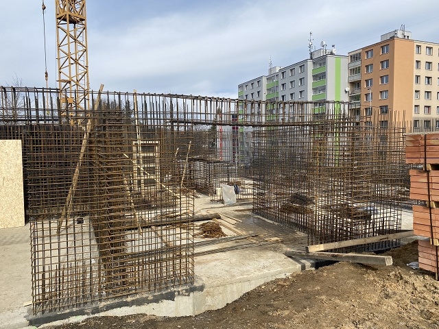 Na základové desce bytového domu A se nyní aktuálně váže výztuž a připravuje se bednění pro realizaci železobetonových stěn.