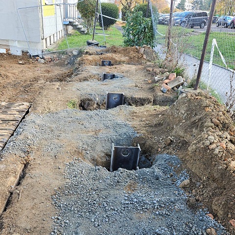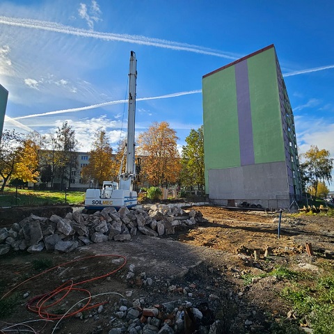 Aktuálně probíhá příprava záporového pažení – to zajistí stavební jámu a bezpečný postup prací.